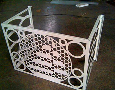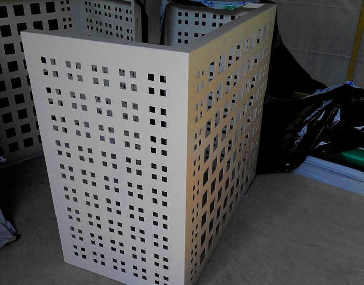 空調(diào)外機(jī)罩采用高強(qiáng)度鋁合金材料制作而成,其主體結(jié)構(gòu)根據(jù)室外空調(diào)主機(jī)尺寸使用整塊鋁合金板沖壓鈑金而成,大面積的開口有利于氣流的流動,減少風(fēng)力對空調(diào)外機(jī)罩的直接作用力,在空調(diào)外機(jī)罩里面和折角處采用加強(qiáng)筋進(jìn)行加固。大大增加空調(diào)外機(jī)罩的強(qiáng)度??朔^去大面積外墻百葉受風(fēng)力或氣壓影響出現(xiàn)的脫落現(xiàn)象。最后由下料、沖孔、折彎、滾弧、焊接、打磨、組裝等多道成型工藝使產(chǎn)品呈現(xiàn)各種幾何形狀。